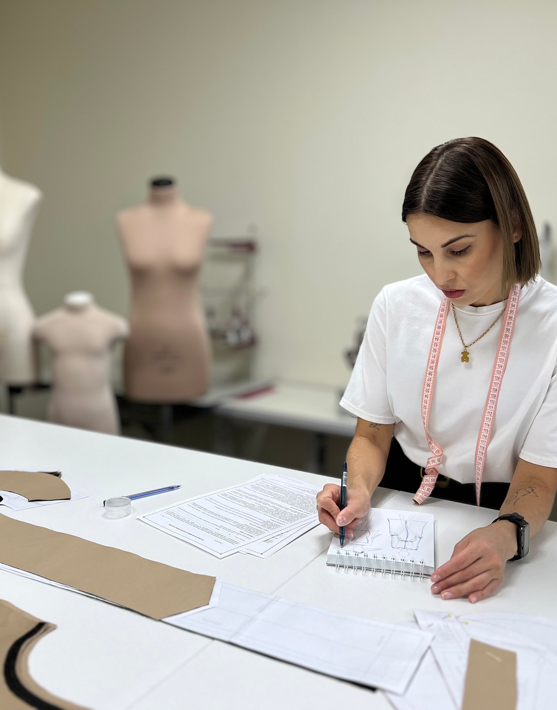 Мы снимаем все необходимые мерки на первой консультации. Это включает обхваты груди, талии, бедер и другие параметры в зависимости от типа изделия.
